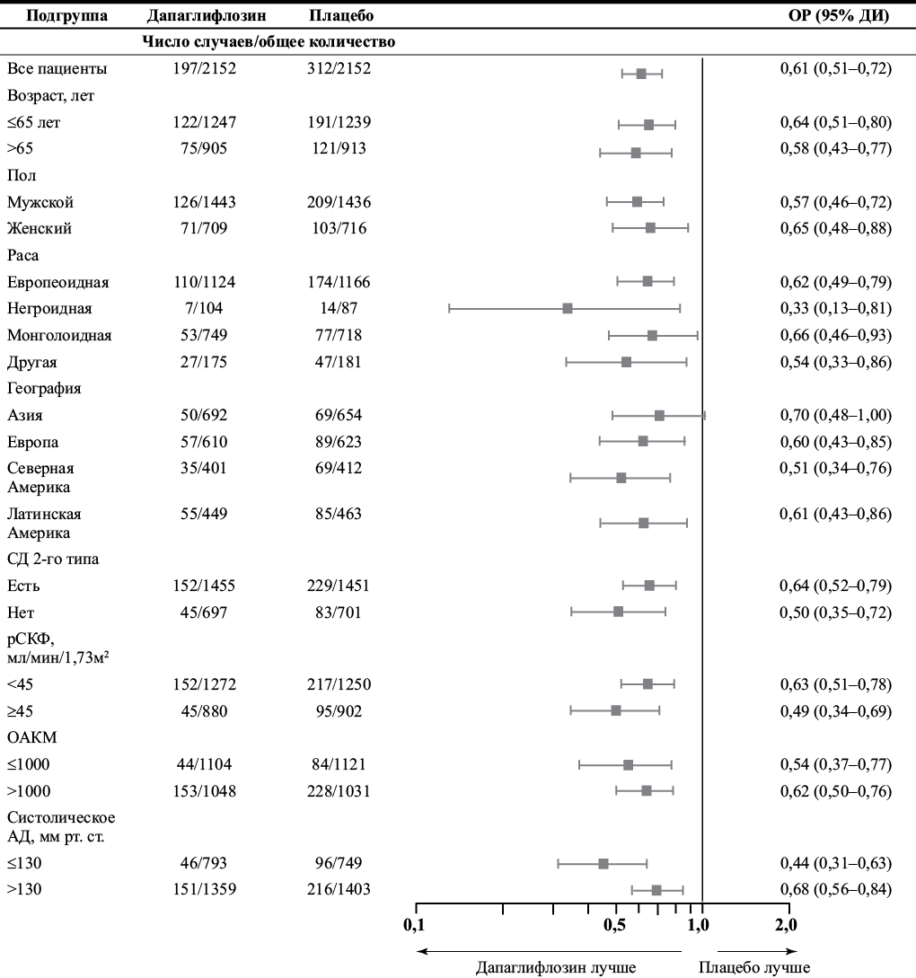 Положительное влияние дапаглифлозина сохранялось в возрасте как старше, так и моложе 65 лет, как в мужской, так и в женской когортах вне зависимости от расы и региона проживания. Также эффект дапаглифлозина сохранялся у больных СД 2-го типа и без него вне зависимости от уровня ОАКМ и систолического артериального давления (АД).