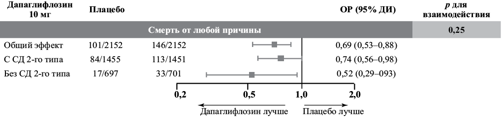 Во время наблюдения умерли 247 (5,7%) пациентов, из которых 91 (36,8%) – от сердечно-сосудистых причин и 102 (41,3%) – от иных причин, у 54 (21,9%) пациентов причина смерти была неопределенной. Умерли 197 пациентов с СД 2-го типа; эти смерти отнесены к сердечно-сосудистой этиологии у 76 (38,6% всех смертей) человек, иной этиологии – у 75 (38,1%) и неопределенной этиологии – у 46 (23,4%). Умерли также 50 пациентов без СД 2-го типа, из них 15 (30,0%) по причине сердечно-сосудистой болезни, 27 (54,0%) – по иной причине, 8 (16,0%) – по неопределенной причине [9]. В ходе анализа показано, что применение дапаглифлозина в сравнении с плацебо снижает смертность от всех причин в группе больных как СД 2-го типа, так и без него (рис. 4).