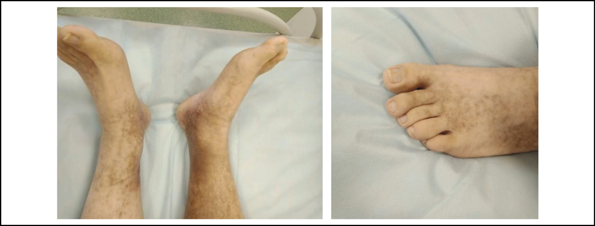 Рис. 1. Ретикулярная пигментация кожи нижних конечностей у Б-1. / Fig. 1. Reticular pigmentation on P-1’s skin of lower extremities.