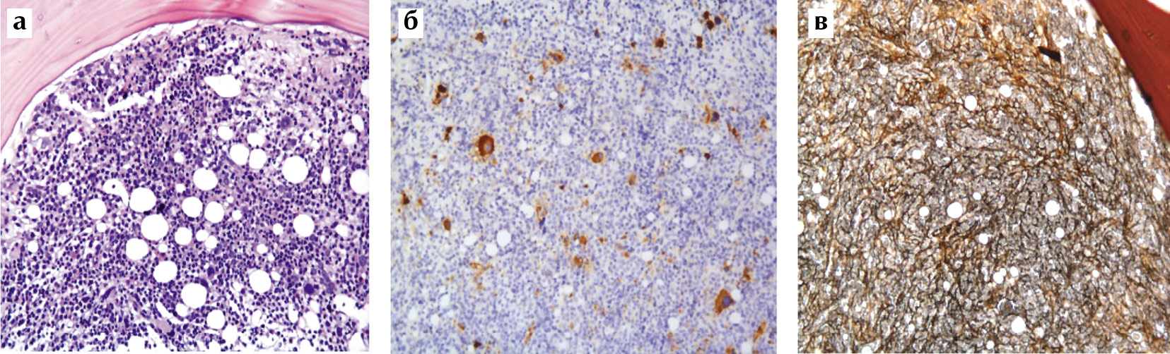 Рис. 2. Гистологическое, иммуногистохимическое и гистохимическое исследования трепанобиоптата костного мозга Б-1: а – трепанобиоптат костного мозга; в широких костномозговых полостях – гиперклеточный костный мозг с расширением эритроидного ростка с дизэритропоэзом, омоложением гранулоцитарного ростка. Окраска гематоксилином и эозином; ув. 200; б – реакция с антителами к CD42b. Увеличено количество небольших мегакариоцитов с монолобулярными ядрами, микроформ = признаки дисмегакариоцитопоэза. Иммуноферментный метод; ув. 200; в – степень фиброза стромы костного мозга составляет MF 2 с участками MF-3. Окраска по Гомори; ув. 200. / Fig. 2. Histochemistry, immunohistochemistry and histochemistry of P-1’s bone marrow trephine biopsy: а – bone marrow trephine biopsy. In wide bone marrow cavities is a hypercellular bone marrow, the growth of erythroid lineage with dyserythropoiesis, a rejuvenation of granulocyte lineage cells. Hematoxylin and eosin stain; ×200; b – reaction with anti-CD42b antibodies. An increased number of small megakaryocytes with monolobular nuclei, microforms = the features of dysmegakaryocytopoesis. enzyme-linked immunosorbent assay; ×200; c – the decree of fibrosis of stroma is MF 2 with sites of MF-3 according to the European Consensus on grading. Gomori's stain; ×200.