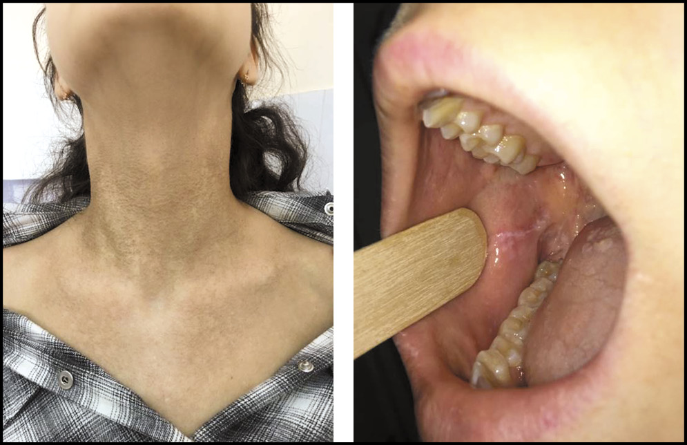 Рис. 3. Ретикулярная пигментация кожи шеи и лейкоплакия полости рта у Б-2. / Fig. 3. Reticular pigmentation on P-2’s skin of neck and oral leukoplakia.