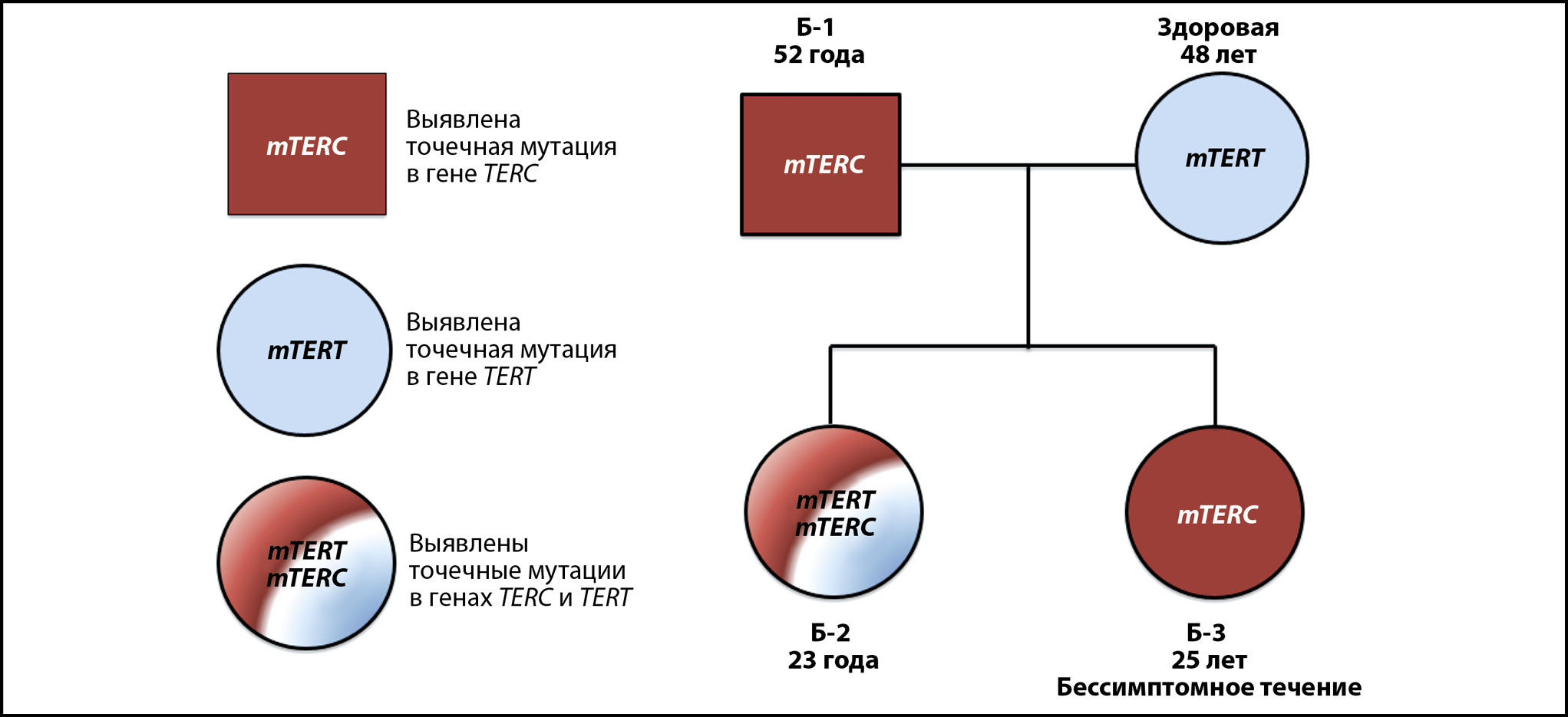 Проведено обследование остальных членов семьи. Известно, что вторая дочь (Б-3), 25 лет, при отсутствии клинической картины ВД имеет умеренную цитопению в течение последних 2 лет (Hb – 118 г/л, PLT – 68×109/л, WBC – 2,2×109/л). При гистологическом исследовании ее трепанобиоптата выявлена гипоплазия костного мозга. Исследование у нее относительной длины теломер выявило укорочение до 7,3, при молекулярно-генетическом исследовании обнаружена гетерозиготная мутация гена TERC (n.99T>C), которую наблюдаемая унаследовала от отца (Б-1). Б-3 также установлен диагноз ВД. От прохождения дальнейшего обследования и лечения больная также отказалась.