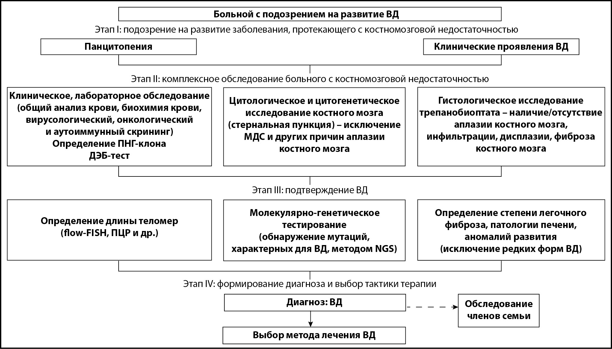 На рис. 5 представлен алгоритм диагностики обследования больных с целью исключения/подтверждения наличия врожденной формы костно-мозговой недостаточности, в частности ВД.