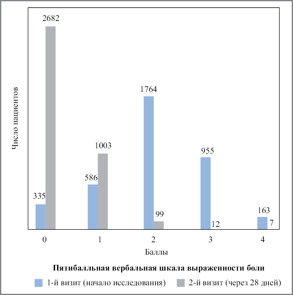 Первичный критерий. Доля пациентов, у которых отмечалось снижение выраженности боли в области живота на 2 балла и более от исходного значения на 2-м визите исследования. Выраженность боли измеряли в баллах по 5-балльной вербальной шкале, где 0 – отсутствие проявлений, 1 – слабовыраженные проявления, 2 – проявления средней интенсивности, 3 – сильные проявления и 4 – очень сильные проявления. Значимым снижением в этом исследовании считали снижение на 2 балла и более от исходного значения. При исходно слабовыраженной боли в области живота (1 балл) значимым считалось снижение выраженности боли на 1 балл.