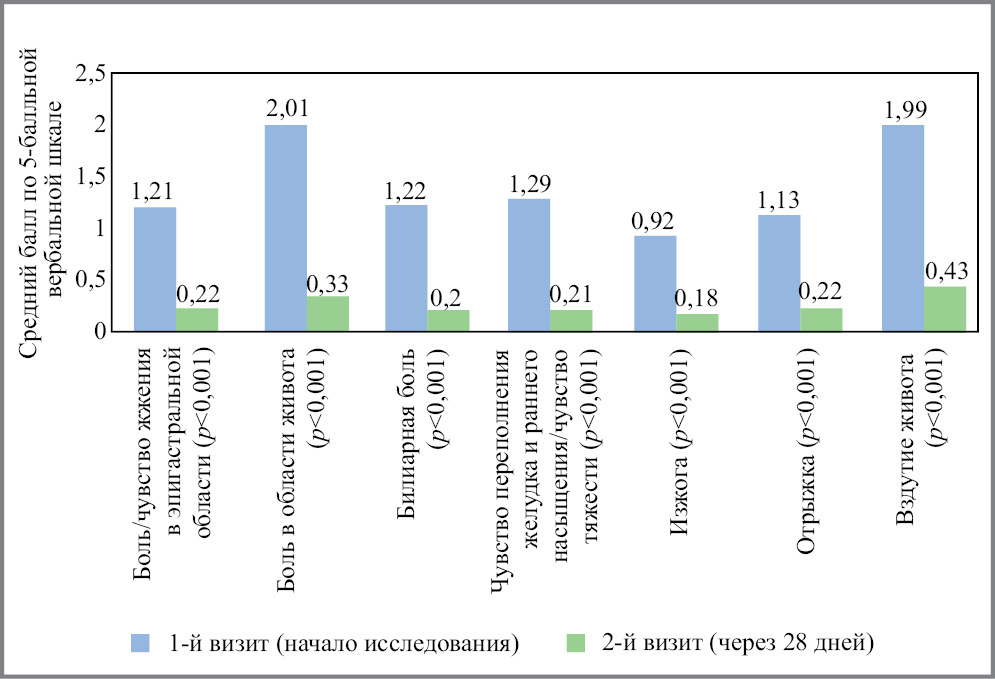 Динамика выраженности отдельных симптомов. После лечения в общей выборке пациентов наблюдалось статистически значимое снижение выраженности боли/чувства жжения в эпигастральной области (среднее значение выраженности боли/чувства жжения в эпигастральной области в баллах на 1-м визите составило 1,21 [95% ДИ 1,18–1,25], на 2-м – 0,22 [95% ДИ 0,2–0,23]; p<0,001), боли в области живота (среднее значение выраженности боли в области живота в баллах на 1-м визите составило 2,01 [95% ДИ 1,98–2,04], на 2-м – 0,33 [95% ДИ 0,31–0,35]; p<0,001), билиарной боли (среднее значение выраженности билиарной боли в баллах на 1-м визите составило 1,22 [95% ДИ 1,18–1,26], на 2-м – 0,2 [95% ДИ 0,19–0,22]; p<0,001), чувства переполнения желудка и раннего насыщения/чувства тяжести (среднее значение выраженности чувства переполнения в желудке и раннего насыщения/чувства тяжести в баллах на 1-м визите составило 1,29 [95% ДИ 1,25–1,32], на 2-м – 0,21 [95% ДИ 0,19–0.22]; p<0,001), выраженности изжоги (среднее значение выраженности изжоги в баллах на 1-м визите составило 0,92 [95% ДИ 0,88–0,95], на 2-м – 0,18 [95% ДИ 0,17–0,20]; p<0,001), выраженности отрыжки (среднее значение выраженности отрыжки в баллах на 1-м визите составило 1,13 [95% ДИ 1,09–1,16], на 2-м – 0,22 [95% ДИ 0,21–0,24]; p<0,001), а также вздутия живота (среднее значение выраженности вздутия живота в баллах на 1-м визите составило 1,99 [95% ДИ 1,96–2,03], на 2-м – 0,43 [95% ДИ 0,41–0,45]; p<0,001); рис. 2.