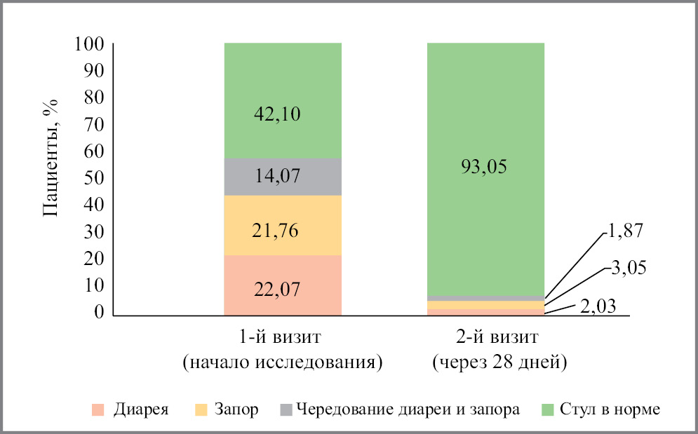 Динамика количества актов дефекации представлена в виде динамики характера стула (диарея, запор, чередование диареи и запора, стул в норме) между 1 и 2-м визитом.