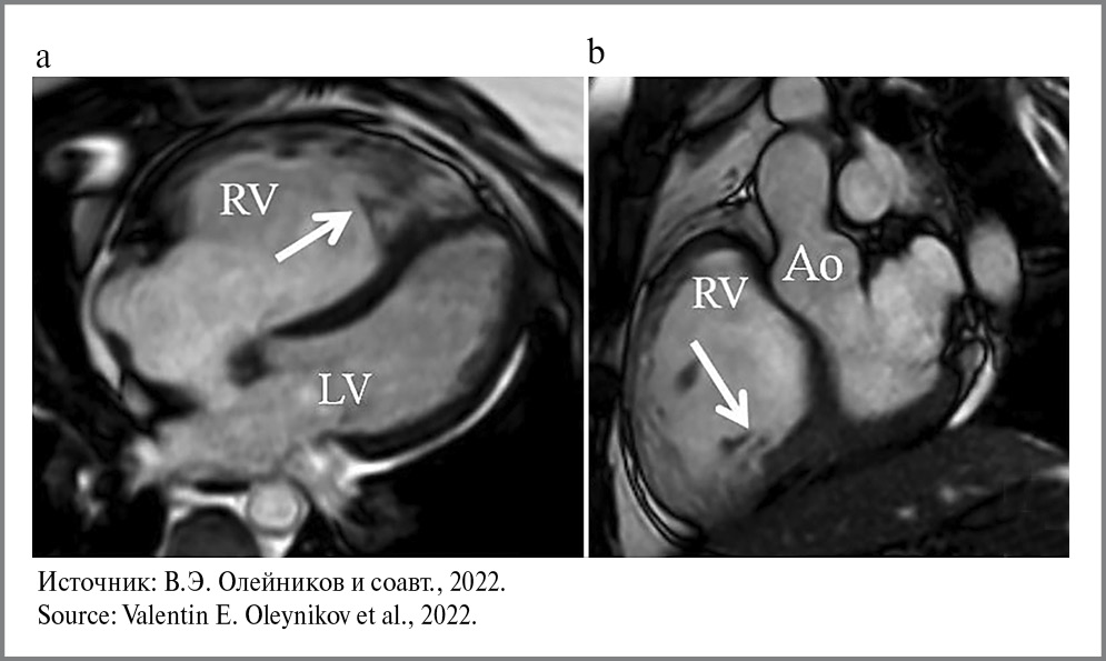 Рис. 1. а – МРТ сердца, четырехкамерная проекция. Стрелка – граница некомпактного миокарда в апикальном отделе ПЖ; b – МРТ сердца, проекция выводного тракта ЛЖ. Стрелка – граница некомпактного миокарда в базальных отделах ПЖ. / Fig. 1. a – magnetic resonance imaging (MRI) of the heart, four-chamber projection. The arrow is the border of the non-compact myocardium in the apical pancreas; b – MRI of the heart, projection of the left ventricular outflow tract. The arrow is the border of the non-compacted myocardium in the basal sections of the right ventricle.