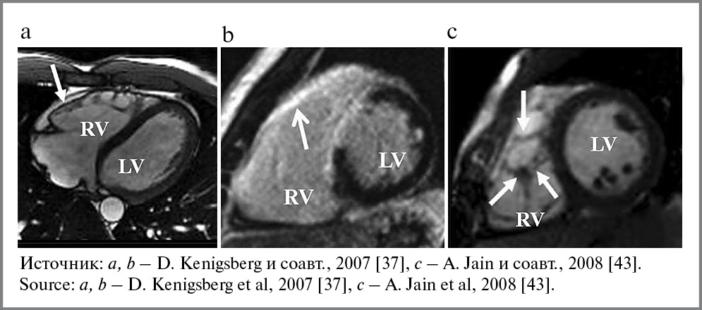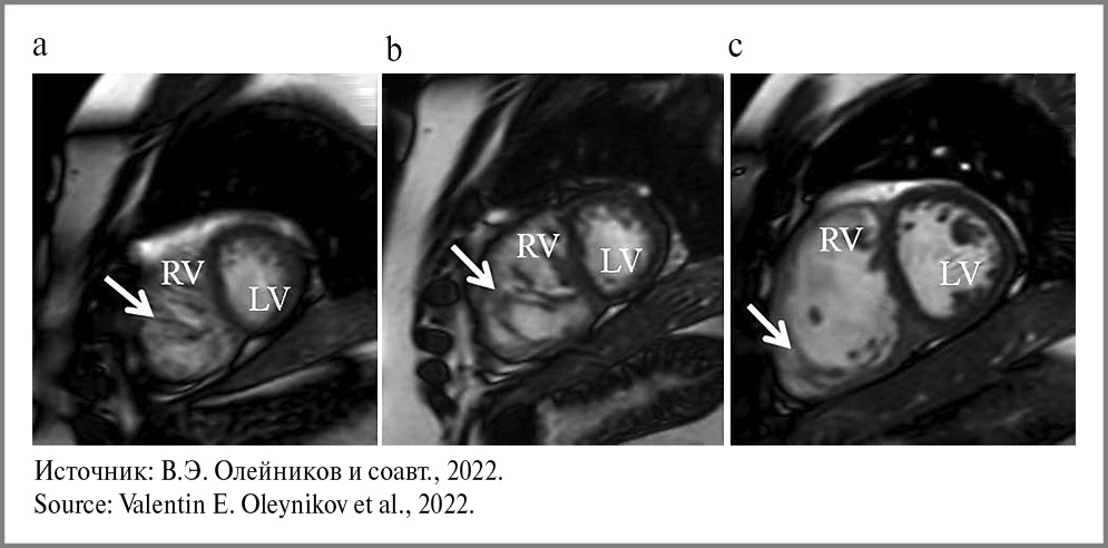 Рис. 3. МРТ при АДПЖ: а – участки жировой инфильтрации при нативном сканировании; b – фиброзные изменения при постконтрастном исследовании; c – повышенная трабекулярность ПЖ. / Fig. 3. MRI for arrhythmogenic right ventricular dysplasia: a – areas of fatty infiltration in native scanning; b – fibrotic changes in post-contrast examination; c – increased trabecularity of the right ventricle.
