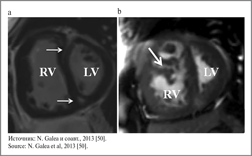 Рис. 4. МРТ при хроническом легочном сердце: а – участки фиброза в основании межжелудочковой перегородки; b – гипертрофия стенки ПЖ с утолщенными трабекулами. / Fig. 4. MRI in chronic cor pulmonale: a – areas of fibrosis at the base of the interventricular septum; b – hypertrophy of the wall of the right ventricle with thickened trabeculae of the right ventricle.