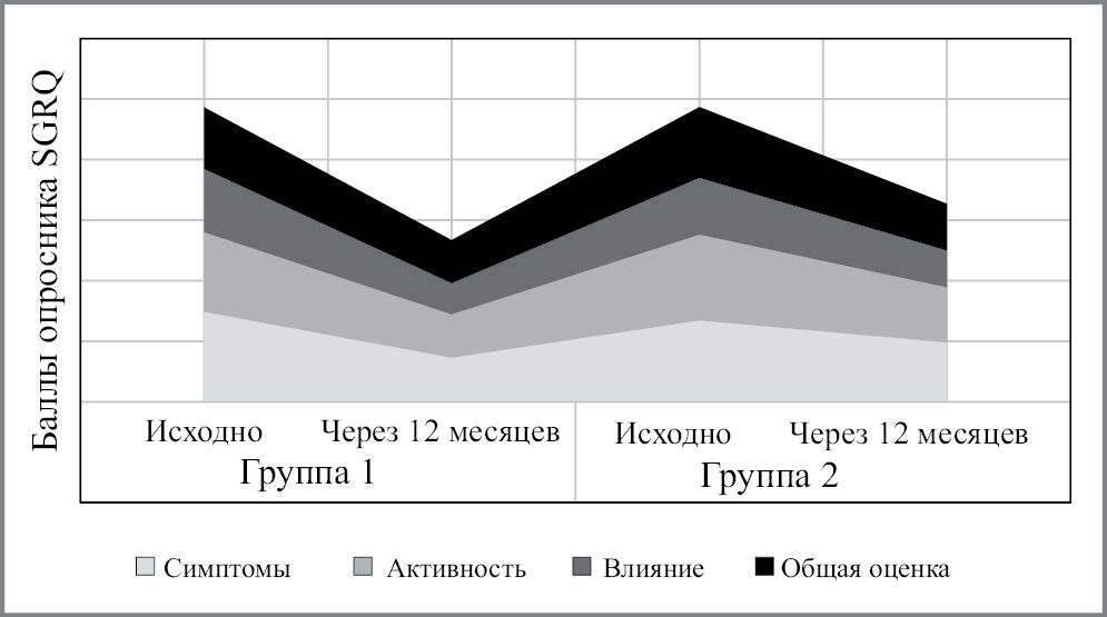 При использовании специализированного респираторного опросника SGRQ выявлено снижение качества жизни у всех пациентов, включенных в исследование. У 6 (13%) из 46 пациентов общая оценка SGRQ составила от 8 до 16%, у остальных 40 (73,9%) больных ХОБЛ общая оценка SGRQ составила более 16%. При межгрупповом анализе обнаружено, что у пациентов 1-й группы исходно превалировали «симптомы», тогда как «влияние» заболевания, напротив, было выше во 2-й группе, однако статистически значимых различий не выявлено (p>0,05).