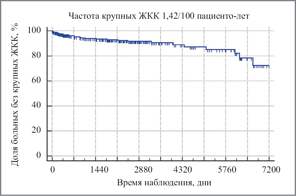 Ограничение. Основу нашего регистра составляют больные среднего возраста, получавшие монотерапию варфарином, что, вероятнее всего, обусловило отсутствие связи возраста и многокомпонентной терапии с развитием крупных ЖКК. Вторым фактором, оказавшим влияние на полученные результаты, является созданная система патронажа за больными, принимающими антикоагулянты, включающая не только коррекцию АКТ, но и всех других факторов риска.