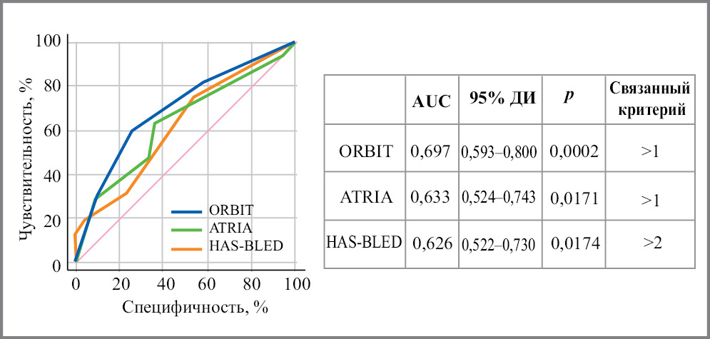 Проведенное сравнение прогностической значимости традиционных шкал оценки риска кровотечений HAS-BLED, ORBIT и ATRIA в отношении риска развития крупных ЖКК показало их сопоставимую значимость, при этом шкала ORBIT обладала наибольшими чувствительностью и специфичностью (рис. 2).