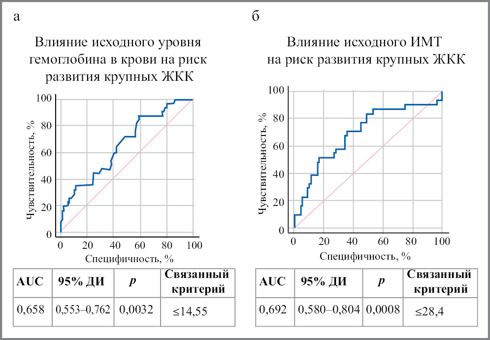 В нашем исследовании предикторами развития крупных ЖКК по данным логистической регрессии оказались следующие параметры: уровень гемоглобина ≤14,5 г/дл, величина ИМТ≤28,4 кг/м2, эрозивно-язвенное поражение ЖКТ и большое геморрагическое осложнение в анамнезе любой локализации.