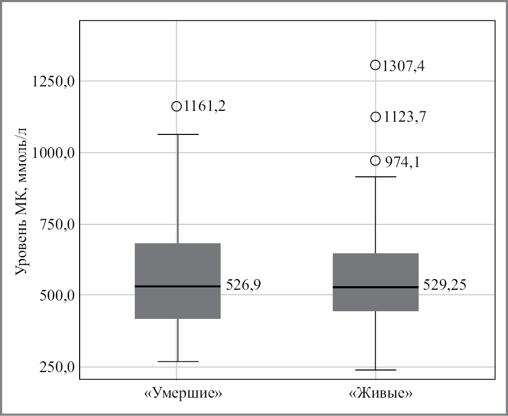 Уровень МК в крови также не отличался среди пациентов исследуемых групп [«живые» – 529,25 (451–645,2), «умершие» – 526,9 (421,5–685,4); р=0,923]; рис. 1.