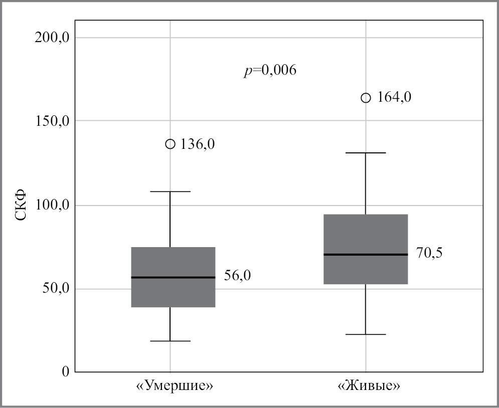 Единственным достоверным различием среди изучаемых параметров явилась скорость клубочковой фильтрации (СКФ), которая достоверно выше в группе «живые» [70,5 (52,8–94) и 56 (40–79) соответственно; р=0,006]; рис. 2.