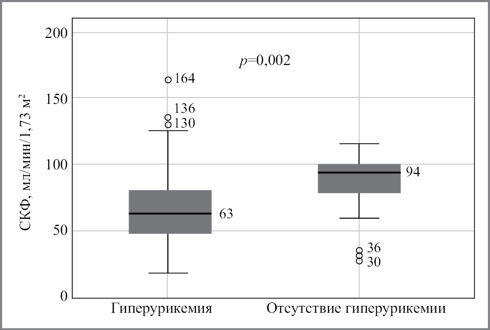 Рис. 4. Уровень СКФ у пациентов с гиперурикемией и без таковой.