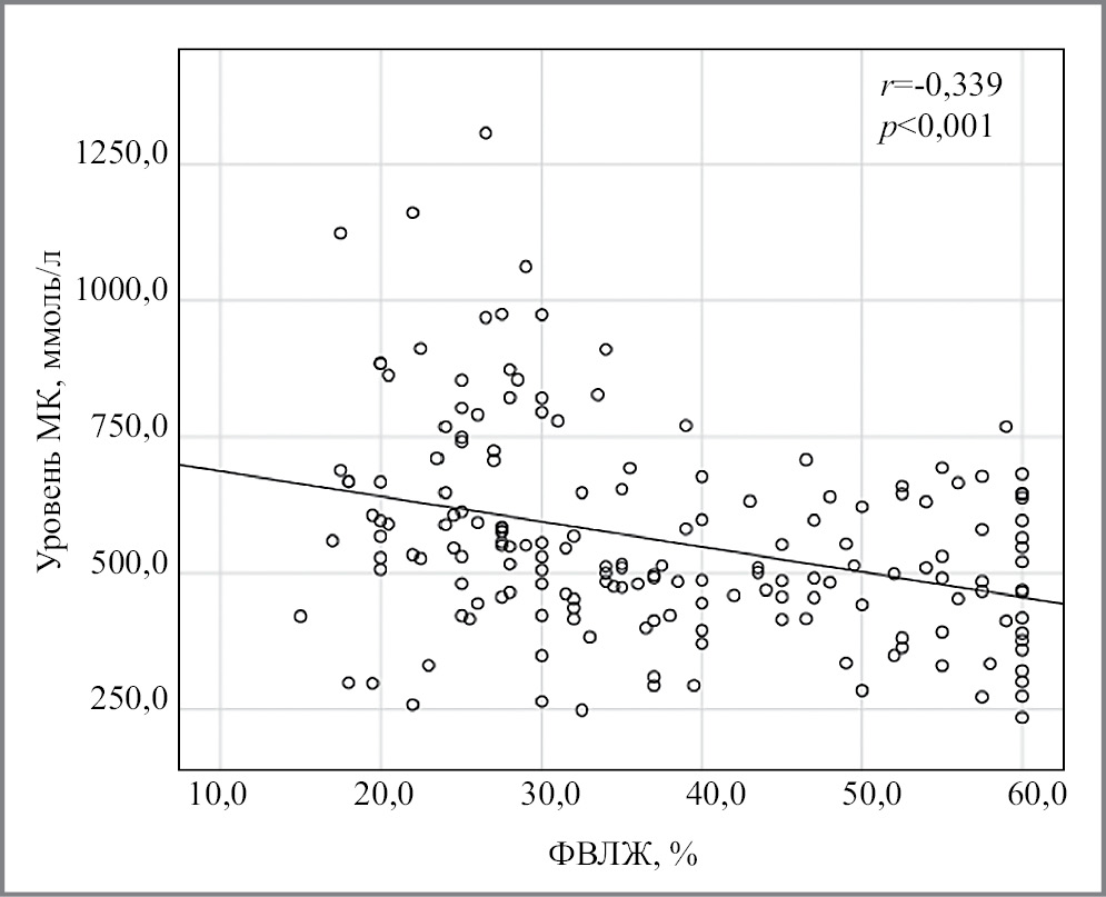 Также отмечена отрицательная корреляционная связь средней силы между уровнем МК в крови и ФВЛЖ (r=-0,339, p<0,001); рис. 5.