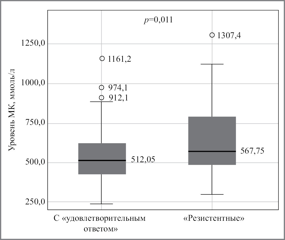 Рис. 6. Уровни МК в крови у больных с «удовлетворительным ответом» и «резистентных» к стандартным дозам внутривенных диуретиков.