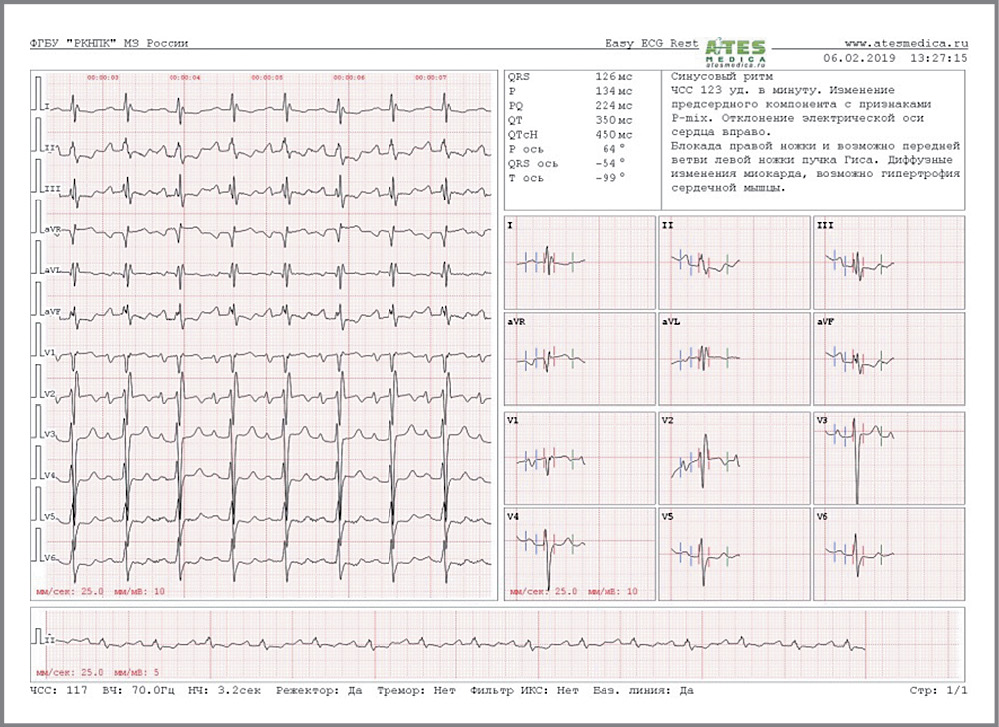 Электрокардиограмма (ЭКГ): синусовый ритм с частотой сердечных сокращений 123 уд/мин, отклонение электрической оси сердца вправо, изменение предсердного компонента с признаками P-miх, атриовентрикулярная блокада 1-й степени, блокада правой ножки и передней ветви левой ножки пучка Гиса (рис. 1).