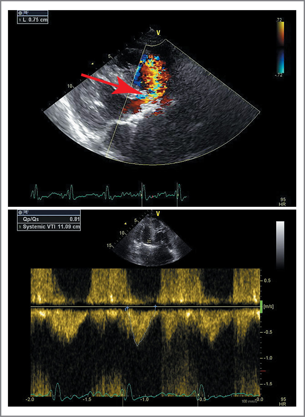 Fig. 2. Echocardiography (EchoCG) on admission. High intraventricular septum defect (indicated by the arrow) with determining the ratio of pulmonary and systemic blood flow.