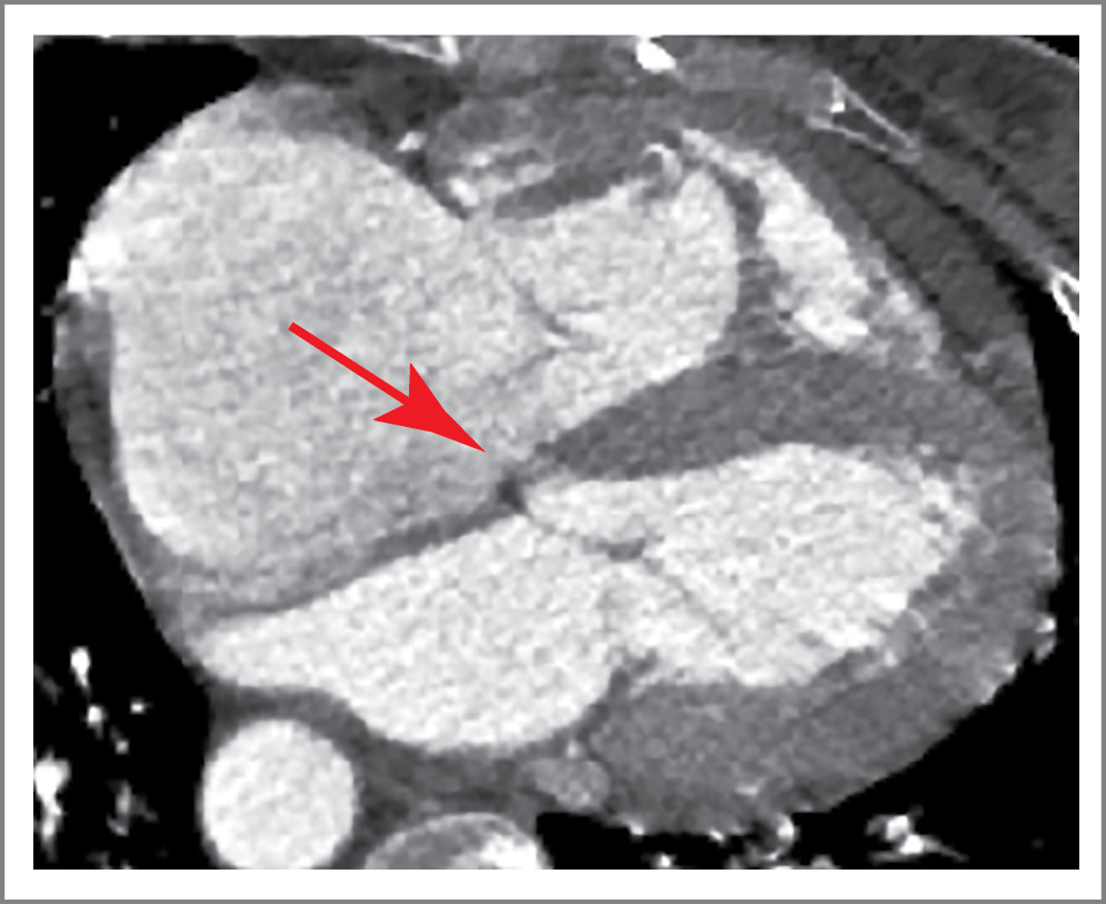 Рис. 3. Мультиспиральная компьютерная томография сердца с внутривенным контрастированием. Стрелкой указан дефект мембранозной части МЖП.