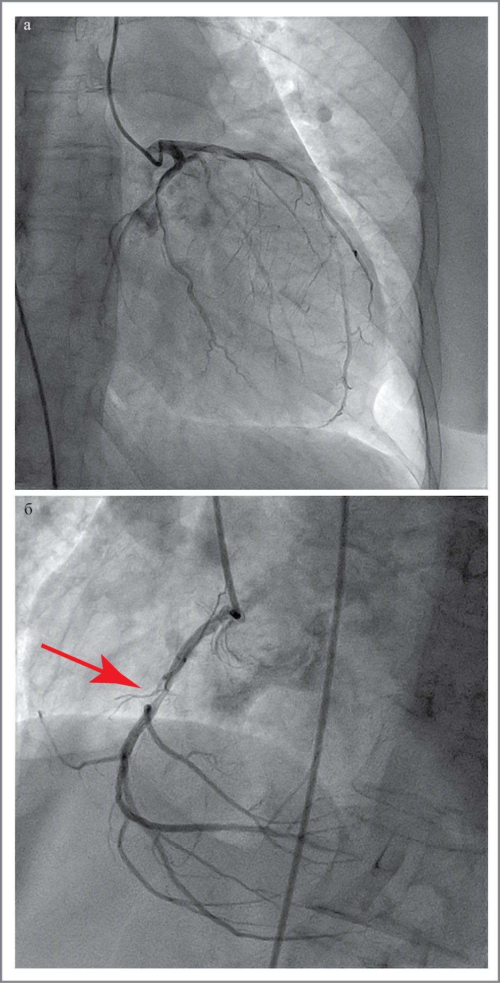 Рис. 4. Коронарограмма: а – левая коронарная артерия; б – правая коронарная артерия (стрелкой обозначен стеноз правой коронарной артерии).
