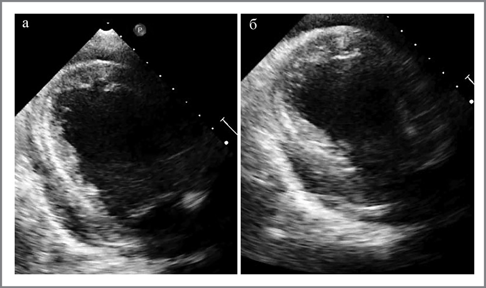 Рис. 6. ЭхоКГ после операции. Акинез средневерхушечных сегментов ЛЖ: a – диастола; б – систола.