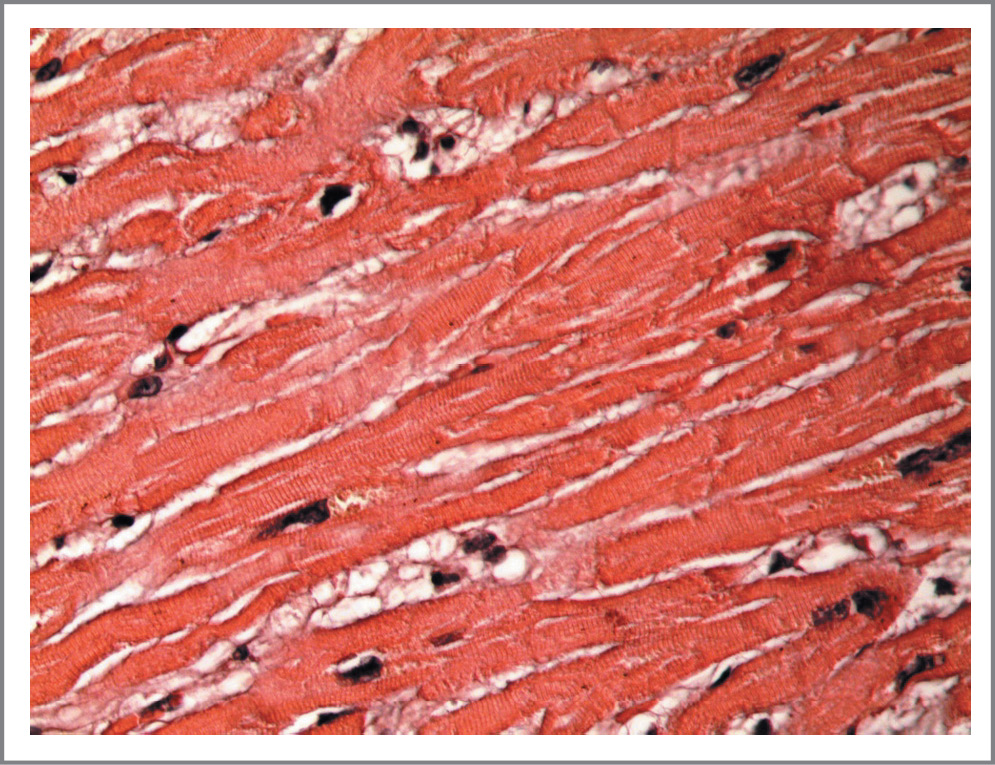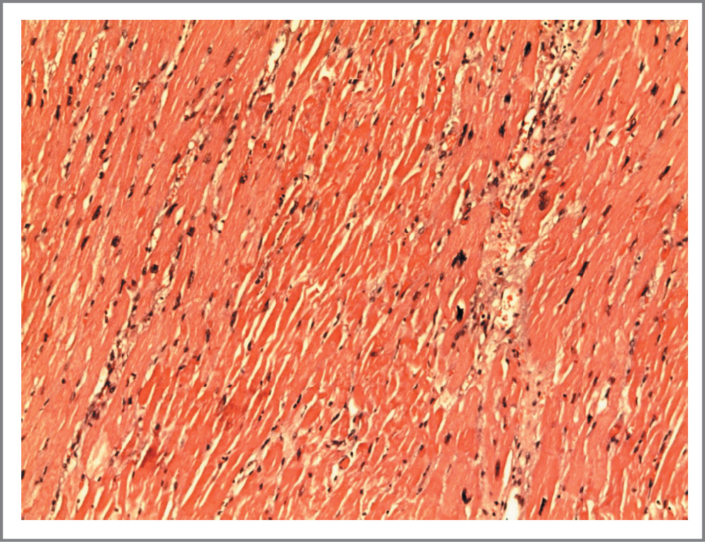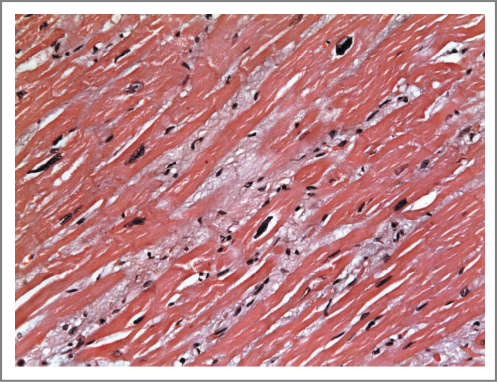 Рис. 11. Подчеркнутая поперечная исчерченность кардиомиоцитов в апикальном отделе ЛЖ. Отек стромы миокарда. Окраска гематоксилином и эозином. ×400.