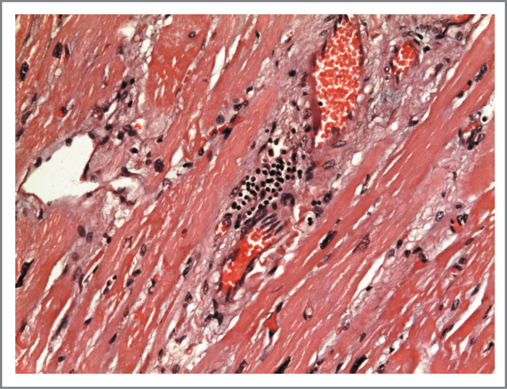 При гистологическом исследовании в миокарде задней стенки ЛЖ найден очаг коагуляционного некроза без выраженного демаркационного вала, с резким расширением и полнокровием сосудов в пограничной области (рис. 7). В разных отделах ЛЖ обнаружены выраженная гипертрофия кардиомиоцитов, диффузный отек стромы миокарда, местами с мукоидизацией, диффузная умеренно выраженная лимфоцитарно-макрофагальная инфильтрация стромы; очаговый миоцитолизис и коагуляционный некроз отдельных групп кардиомиоцитов, очаговые лимфогистиоцитарные инфильтраты, расширение и полнокровие венозных сосудов, сладж-феномен (рис. 8, 9). Имелись участки кардиосклероза с разрыхлением и отеком фиброзной ткани, с диффузной лимфогистиоцитарной инфильтрацией (рис. 10). В кардиомиоцитах апикального отдела ЛЖ отмечена выраженная поперечная исчерченность кардиомиоцитов (рис. 11).