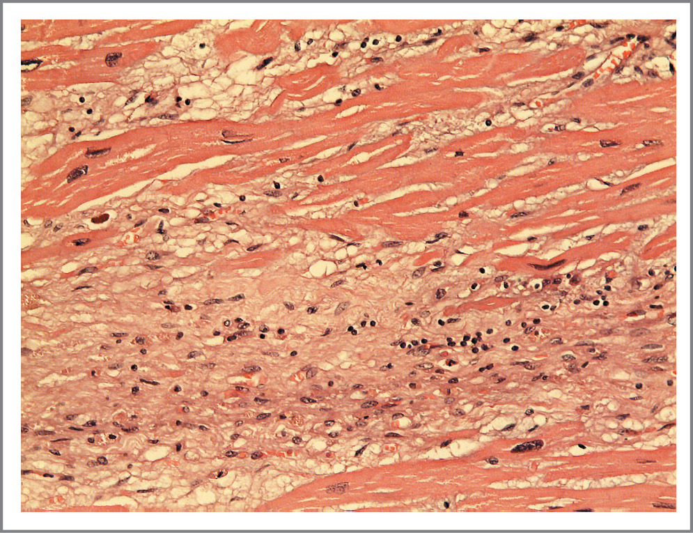 Рис. 8. Диффузный отек стромы миокарда с мукоидизацией. Диффузная умеренно выраженная лимфоцитарно-макрофагальная инфильтрация стромы. Очаговый миоцитолизис. Гипертрофия кардиомиоцитов. Окраска гематоксилином и эозином. ×200.