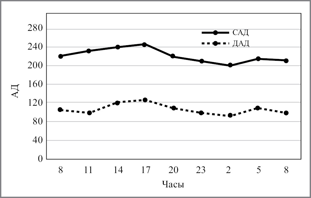 Рис. 2. Трехчасовое измерение АД при поступлении.