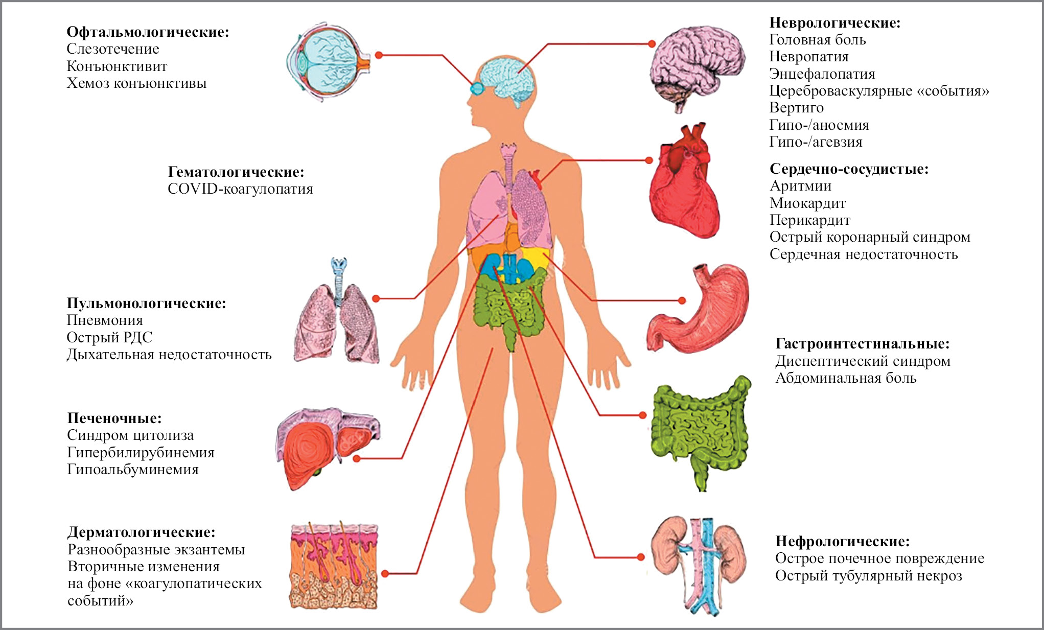 По мере накопления информации относительно клинического течения и спектра органной патологии при новой коронавирусной инфекции оказалось, что респираторный тракт и легкие не являются единственной мишенью для вируса, и на сегодняшний день описаны возможности вовлечения в патологический процесс целого ряда систем и органов (рис. 1) [10].