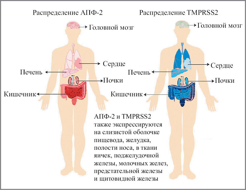 Рис. 2. Распределение рецепторов АПФ-2 и TMPRSS2 в различных системах органов человека. Интенсивность цвета отражает уровень экспрессии генов данных рецепторов (адаптировано [11]).