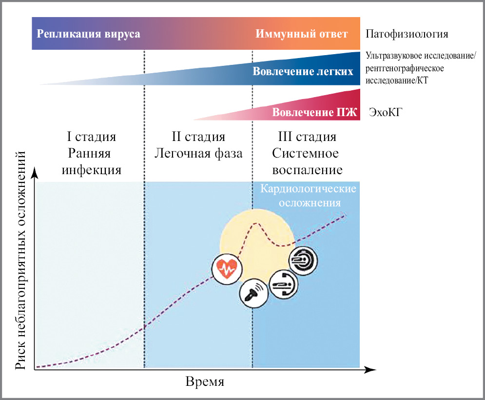 Рис. 3. Патофизиология и клиническая прогрессия COVID-19 (адаптировано [28]).
