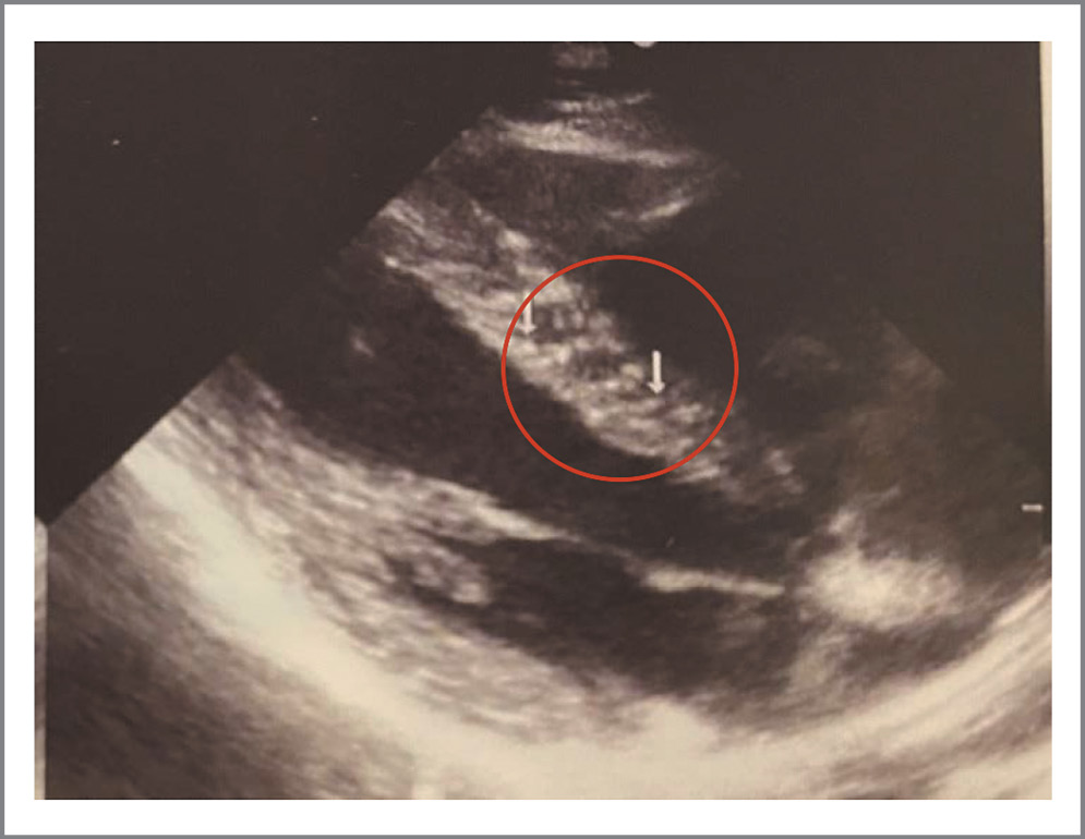 Рис. 5. ЭхоКГ, парастернальная позиция, длинная ось ЛЖ, примеры линейных участков фиброза в межжелудочковой перегородке.