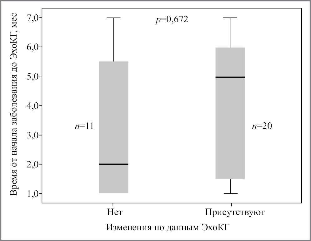 При анализе данных, полученных при ЭхоКГ в группе перенесших COVID-19, оказалось, что выявленные изменения пери/миокарда не зависели от давности начала заболевания, как показано на рис. 7.