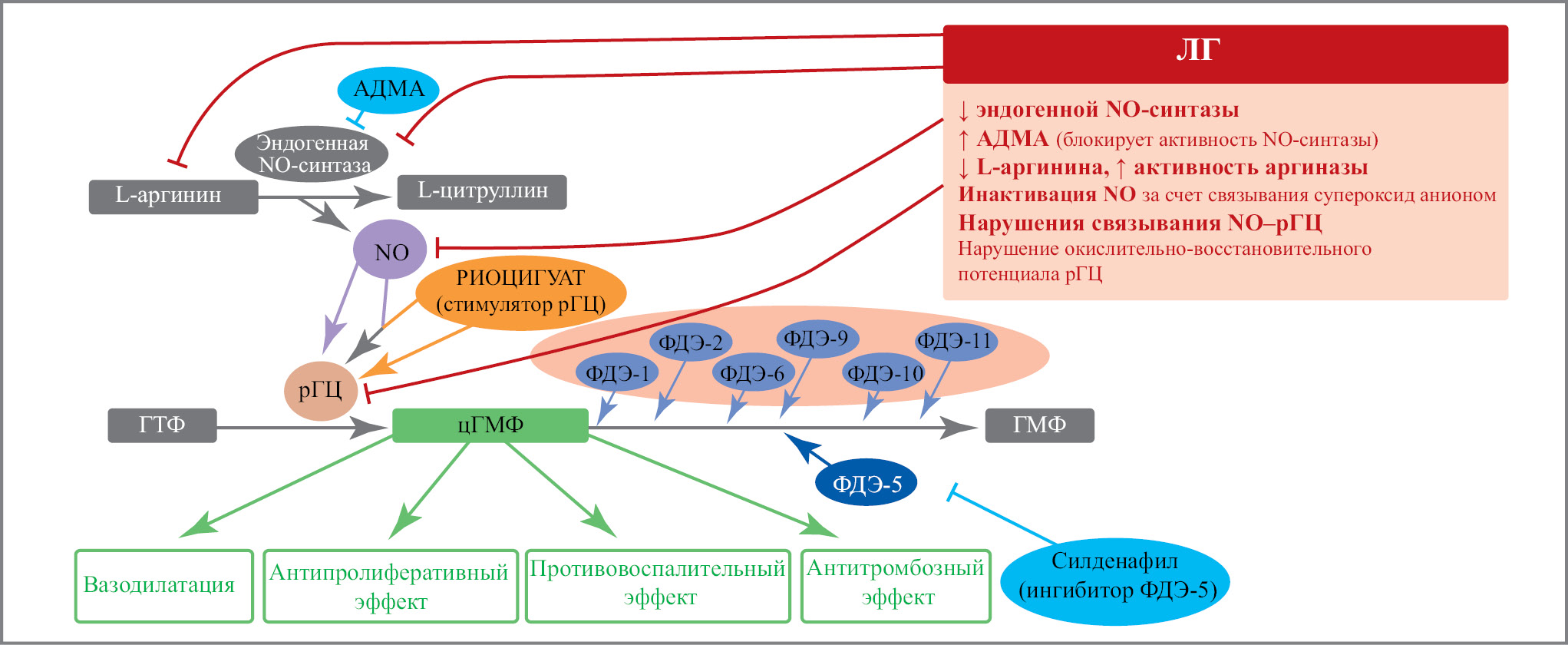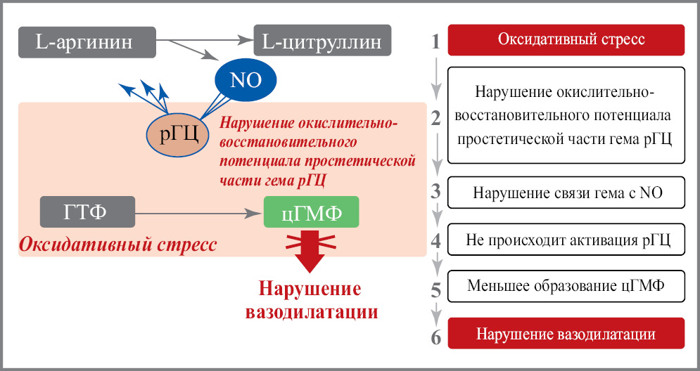 Кроме того, при ЛГ из-за нарушения окислительно-восстановительного потенциала простетической части гема нарушается связывание NO c рГЦ и снижается активация рГЦ [7–9].