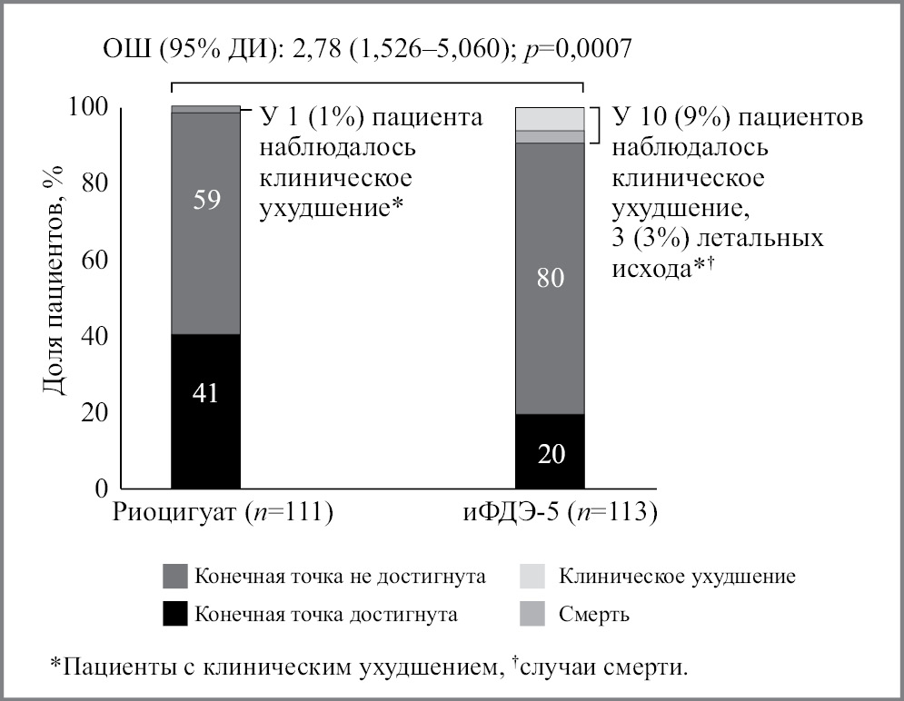 К 24-й неделе терапии первичная конечная точка достигнута у 45 (41%) пациентов в группе риоцигуата и у 23 (20%) – в группе иФДЭ-5 [отношение шансов (ОШ) 2,78, 95% доверительный интервал (ДИ) 1,53–5,06, p=0,0007]; рис. 3 [57]. Благоприятный профиль эффективности риоцигуата наблюдался в подгруппах идиопатической, наследуемой и ассоциированной с приемом лекарств и токсинов ЛАГ (ОШ 2,63, 95% ДИ 1,32–5,23), ассоциированной с ЗСТ ЛАГ (ОШ 1,78, 95% ДИ 0,38–8,30) и ассоциированной с ВПС или портальной гипертензией ЛАГ (ОШ 10,29, 95% ДИ 1,02–103,95). Следует отметить, что в РФ для ассоциированной с приемом лекарств и токсинов, с ВПС и портальной гипертензией ЛАГ риоцигуат не зарегистрирован***. Клиническое ухудшение наблюдалось у 1 (1%) пациента в группе риоцигуата и у 10 (9%) – в группе иФДЭ-5 (см. рис. 3). Время до первого события клинического ухудшения в группе риоцигуата было больше (отношение рисков 0,10, 95% ДИ 0,01–0,79, р=0,007). Эскалация терапии потребовалась 2 (2%) пациентам в группе риоцигуата и 9 (8%) больным в группе иФДЭ-5. В группе иФДЭ-5 умерли 3 больных, еще 1 пациент в группе иФДЭ-5 умер в период наблюдения за безопасностью.