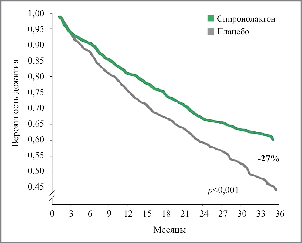 Первым крупным исследованием, подтвердившим эффекты спиронолактона при ХСН, стало исследование RALES (Randomized ALdactone Evaluation Study, 2000 г.), включившее 1600 больных с прогрессирующей застойной ХСН, получавших спиронолактон (в средней дозе 27 мг/сут) или плацебо в дополнение к стандартной терапии ингибиторами АПФ, диуретиками и сердечными гликозидами, и завершившееся досрочно в связи с неоспоримыми преимуществами применения спиронолактона (рис. 2) [26].