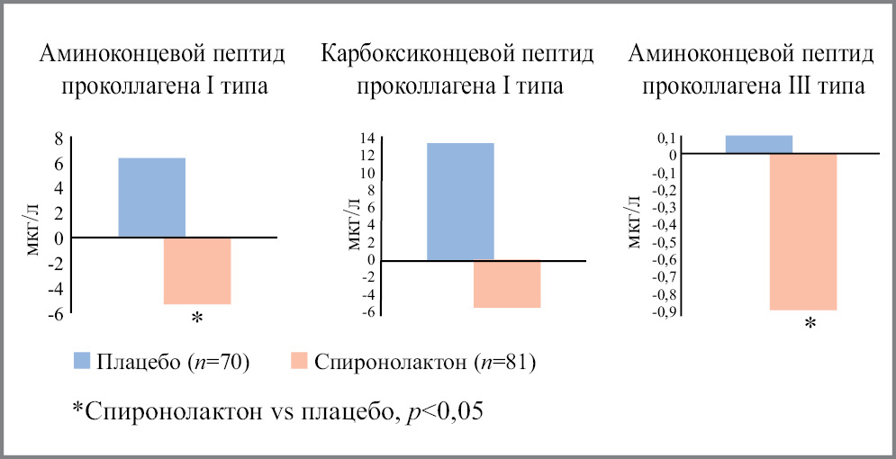 Для выяснения причин столь значимого влияния спиронолактона на сердечно-сосудистые события у больных с ХСН проведен биохимический анализ маркеров миокардиального фиброза – аминоконцевых пептидов проколлагена I и III типов и карбоксиконцевого пептида проколлагена I типа [26]. Показано, что при ХСН высокие исходные уровни сывороточных маркеров фиброза, ассоциированные с неблагоприятным прогнозом, значимо снижались во время терапии спиронолактоном (рис. 3).