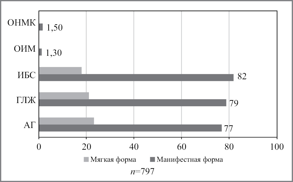 Рис. 2. Частота кардиоваскулярных нарушений на фоне манифестной и мягкой формы, по данным Всероссийского регистра (%).