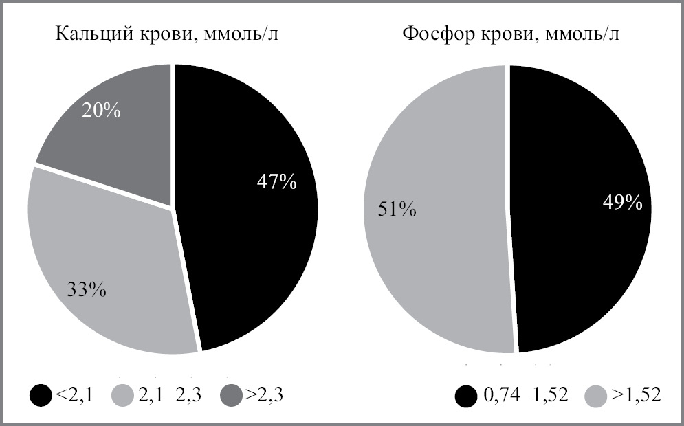 Рис. 3. Распространенность нецелевых показателей кальциемии и фосфатемии у пациентов с гипопаратиреозом, по данным регистра.