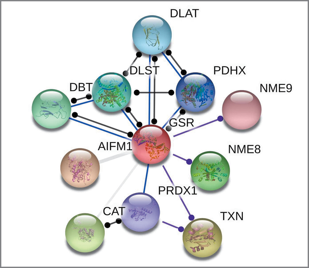 Анализ взаимодействий GSR с другими генами на уровне белковых продуктов, выполненный с помощью инструмента STRING, показал, что глутатионредуктаза образует сеть из 10 белков (рис. 1), с 5 из которых фермент связан физически. Анализ обогащения терминами генных онтологий Gene Ontology обнаружил, что 4 фермента – дигидролипоамид-S-ацетилтрансфераза (DLAT), пируватдегидрогеназа (PDHX), дигидролипоамид-S-сукцинилтрансфераза (DLST) и дигидролипоамид-ветвящая-трансацилаза (DBT) – обеспечивают метаболизм ацетил-коэнзима А – ацетил-КоА (p=3,06×10-6, FDR=8,06×10-3). Другие 6 белков сети: тиоредоксин (TXN), пероксиредоксин 1 (PRDX1), тиоредоксин-доменсодержащий белок 3 (NME8), тиоредоксин-доменсодержащий белок 6 (NME9), каталаза (CAT), митохондриальный апоптозиндуцирующий фактор 1 (AIFM1) совместно с GSR ответственны за катаболизм H2O2 (p=1,42×10-4, FDR=4,89×10-2) и поддержание редокс-гомеостаза (p=1,01×10-9, FDR=1,59×10-5). Таким образом, с одной стороны, глутатионредуктаза получает от ферментов метаболизма ацетил-КоА восстановительные эквиваленты, необходимые для ресинтеза GSH из GSSG, а с другой – обеспечивает тиоредоксины и пероксиредоксины мономером глутатиона, способствуя снижению окислительной напряженности митохондриального матрикса.