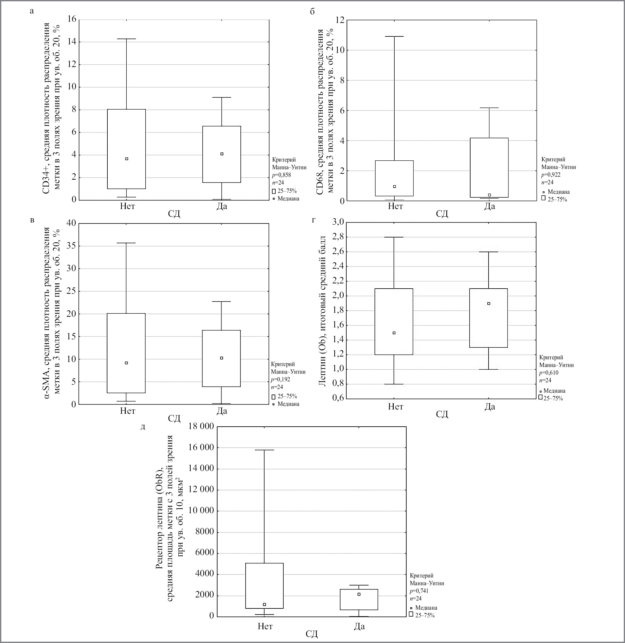 Рис. 1. Сравнение результатов оценки экспрессии CD68, α-SMA, CD34, рецептора лептина и лептина в атеросклеротических бляшках в группах пациентов с СД 2-го типа и без СД: а – распределение средней площади CD34+ в участках атеросклеротической бляшки у пациентов с СД и без; б – распределение средней площади CD68 в участках атеросклеротической бляшки у пациентов с СД и без; в – распределение средней площади α-SMA в участках атеросклеротической бляшки у пациентов с СД и без; г – итоговый средний балл распределения лептина в участках атеросклеротической бляшки у пациентов с СД и без; д – распределение средней площади рецептора лептина в участках атеросклеротической бляшки у пациентов с СД и без.