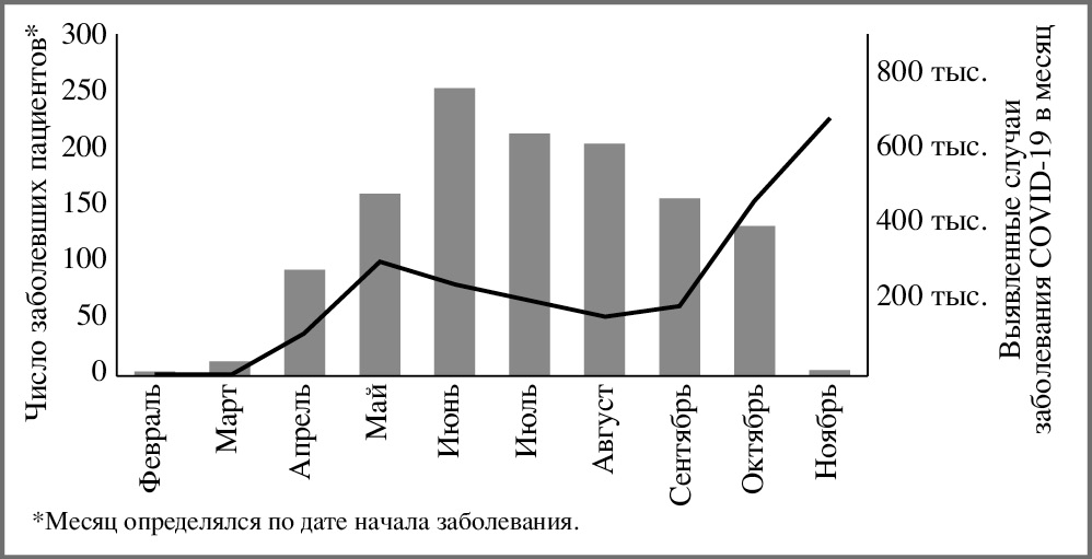 Рис. 1. Заболеваемость COVID-19 в РФ в период проведения исследования (черная линия) и число заболевших пациентов, включенных в исследование в течение 2020 г.