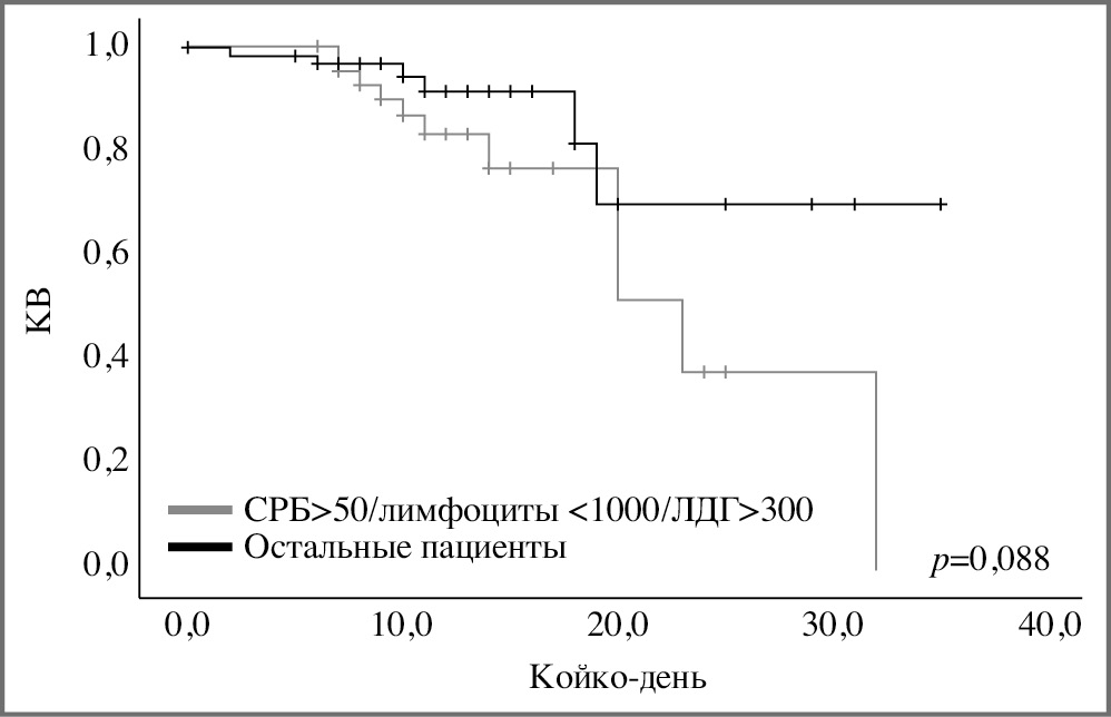 Согласно биохимическим диагностическим критериям синдрома цитокинового шторма [17] дополнительно проанализирована отдельная категория пациентов, у которых при поступлении зарегистрированы снижение количества лимфоцитов менее 1000 Ед/л и повышение уровня СРБ более 50 мг/л. Эту категорию сравнили с группой пациентов, имевших уровень СРБ менее 50 мг/л и уровень лимфоцитов выше 1000 Ед/л. В группу больных с СРБ менее 50 мг/л и лимфоцитами более 1000 Ед/л вошли 59 человек, а с СРБ более 50 мг/л и лимфоцитами менее 1000 Ед/л – 43.