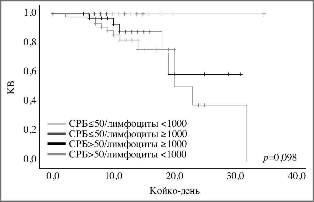 Рис. 2. Кривая выживаемости пациентов с COVID-19 в зависимости от лабораторных показателей (СРБ</>50 мг/л, лимфоциты </>1000 абс.).