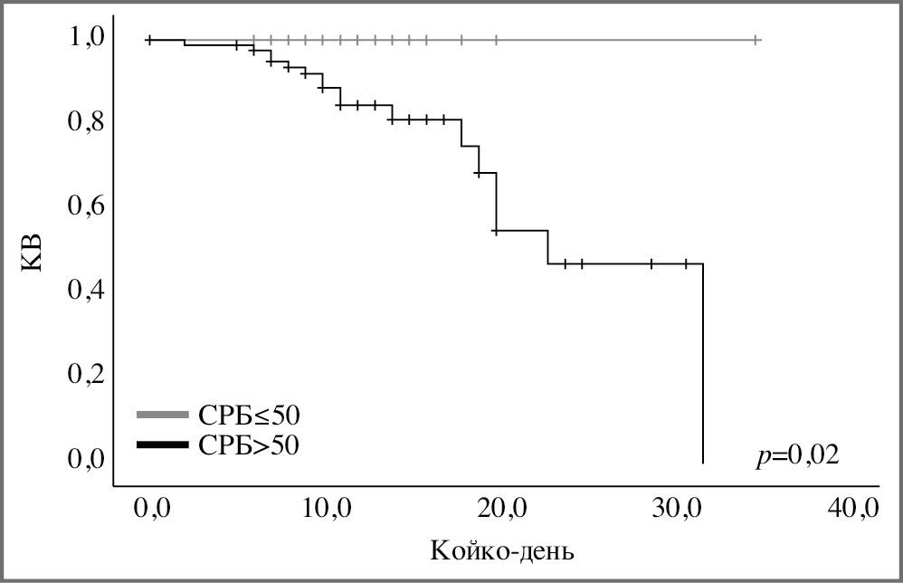 Рис. 3. Кривая выживаемости пациентов с COVID-19 в зависимости от лабораторных показателей (СРБ>/<50 мг/л).
