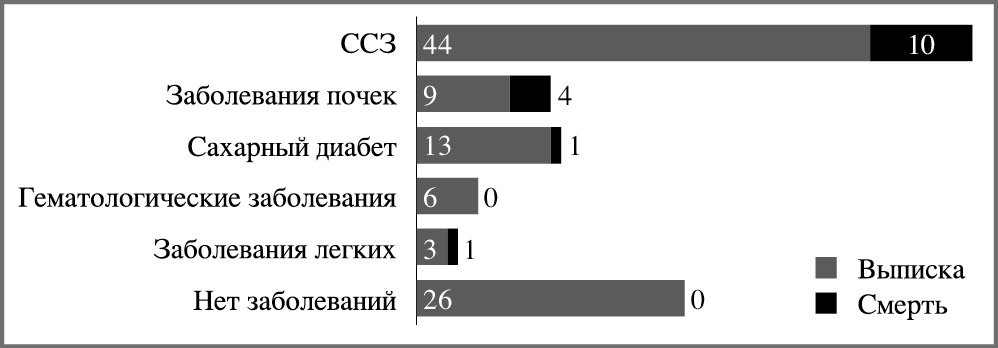 Для анализа коморбидных состояний и летальных исходов были объединены группы пациентов, получивших САР (n=101). Выбор был не случаен: эти пациенты получали блокатор ИЛ-6Р в самые ранние сроки (не позднее 2-го дня госпитализации). У данных пациентов летальные исходы наблюдались исключительно при наличии сопутствующих заболеваний, а именно в 19% случаев у пациентов с ССЗ, в 31% – у пациентов с хронической почечной патологией (рис. 5).
