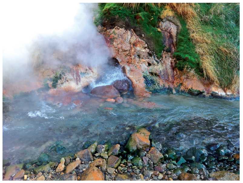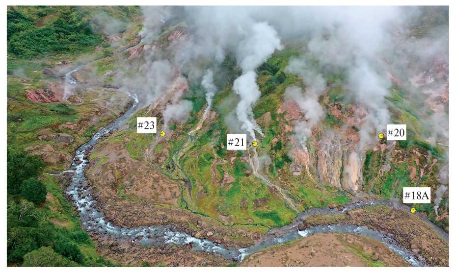 Рис. 1. Нижне-Гейзерное поле – участок разгрузки наиболее крупных гейзеров, включая Грот (#20), Аверий (#21) и Великан (#23). Снизу от Грота (#20) в русле р. Гейзерная находится Малахитовый Грот (#18A). Фото И.П. Шпиленок, 2023.